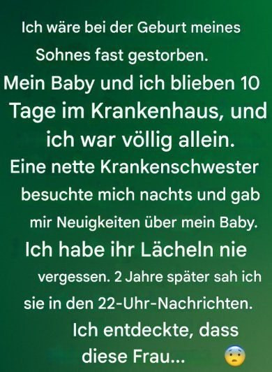 Eine Krankenschwester schlüpfte herein – leise Schritte, warme Augen, dieses ruhige Lächeln, das mir das Gefühl gab, wieder atmen zu können. Sie setzte sich neben mich, sprach manchmal mit mir, manchmal leistete sie mir einfach nur Gesellschaft, während ich unwillkürlich weinte.