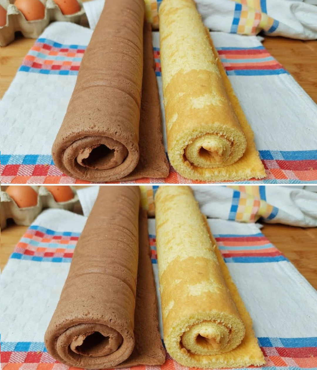 Zuerst die Eier in eine Schüssel geben und ca. 15 Sekunden lang schaumig schlagen. Dann den Zucker hinzufügen und schaumig schlagen. Das gesiebte Mehl unterheben und vorsichtig vermengen. Den Teig auf einem mit Backpapier ausgelegten Backblech im vorgeheizten Backofen bei 180 °C ca. 10 Minuten backen. Nach 10 Minuten die Ofentür öffnen und den Biskuitkuchen weitere 5 Minuten an der Luft trocknen lassena. Den Biskuitkuchen auf ein sauberes Küchentuch mit dem Backpapier darauf stürzen. Das Backpapier vorsichtig entfernen und den Biskuitkuchen mithilfe des Tuchs aufrollen. Vollständig abkühlen lassen.