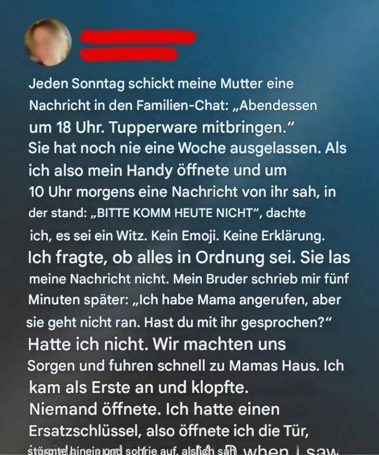 Als sie mir also an einem Sonntagnachmittag eine kurze SMS schickte, in der nur stand: „Bitte komm heute nicht“, sank mir das Herz. Keine Erklärung. Kein Smiley. Nur fünf beunruhigende Worte. Mein Bruder und ich wechselten einen Blick und wussten sofort, dass etwas nicht stimmte. Wir ignorierten die Nachricht, stiegen ins Auto und fuhren direkt zu ihr, die Angst schnürte uns die Kehle zu.