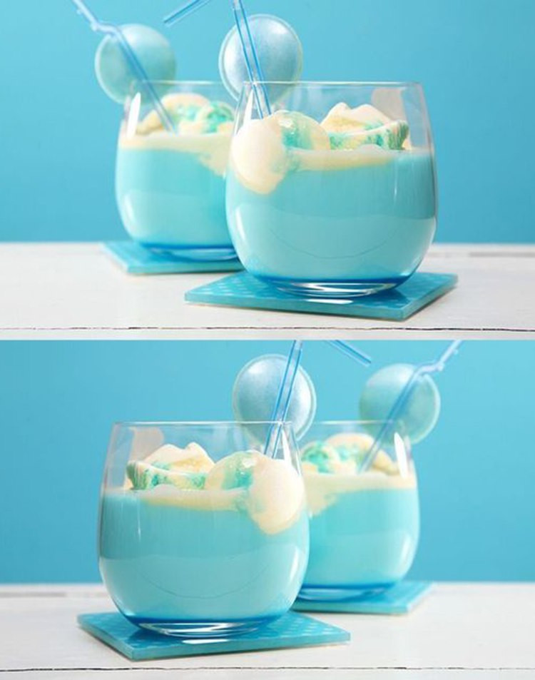 Zutaten: 350 ml Vollmilch etwas Vanilleeis 5 EL Sirup Blue Curacao (oder alkoholfrei) Zubereitung: